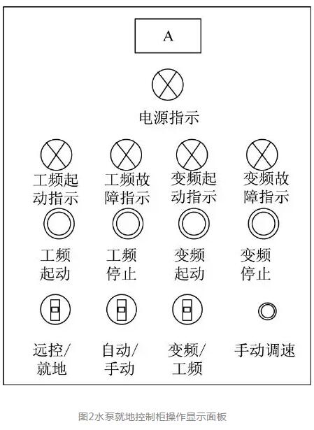 清凈水泵就地控制柜操作顯示面板如圖2所示。水泵工頻運(yùn)行時(shí)“工頻起動指示燈”點(diǎn)亮,工頻故障時(shí)“工頻故障指示燈”點(diǎn)亮;水泵變頻運(yùn)行時(shí)“變頻起動指示燈”點(diǎn)亮,變頻故障時(shí)“變頻故障指示燈”點(diǎn)亮。