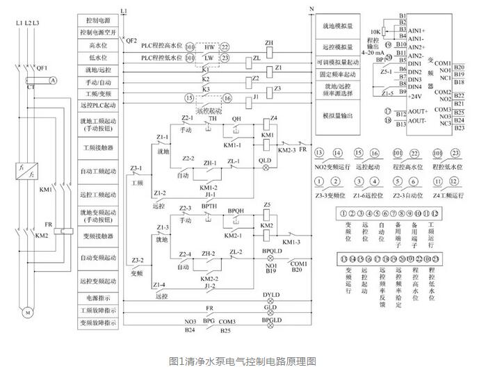 (6)清凈水泵本體擴(kuò)容改進(jìn),配套電動機(jī)功率由15kW升至75kW。4設(shè)備改進(jìn)后的電氣控制原理改進(jìn)后的清凈水泵電氣控制電路實(shí)現(xiàn)如下功能:在遠(yuǎn)方控制方式下,可從PLC程控畫面工頻起動和變頻起動水泵;在自動操作形式下水處理設(shè)備,水泵的起停受水池高、低液位自動控制,水池液位達(dá)到高水位定值(3m)時(shí),PLC程控高水位接點(diǎn)閉合自動起動水泵,水池液位降至低水位定值(1.5m)后,程控低水位接點(diǎn)閉合自動停運(yùn)水泵;在變頻運(yùn)行模式下,可從水泵就地控制柜和PLC程控畫面調(diào)節(jié)變頻器輸出頻率。